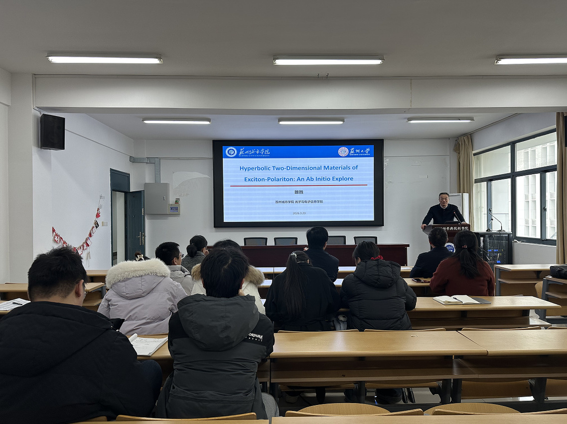 3月20日下午,苏州城市换妻视频 光学与电子信息换妻视频 院长雎胜教授受邀来换妻视频 指导,并为换妻视频 师生做题为“激子极化激元双曲二维材料的从头探索”的学术报告。换妻视频院长仲崇贵主持报告会。