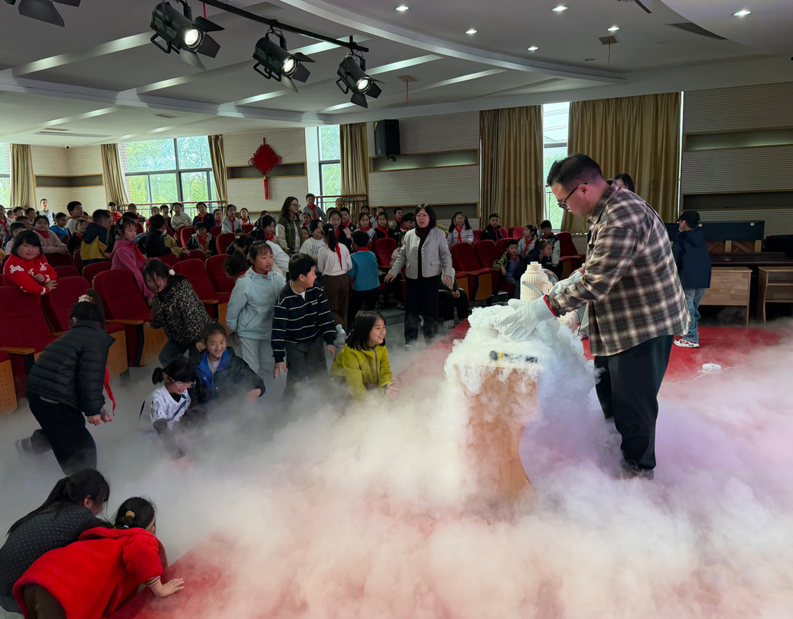 活动伊始,一系列经典力学实验瞬间抓住孩子们的眼球。“乒乓球大炮”利用气流形成的压力差,推着乒乓球高速飞行;“马德堡半球”实验中,小朋友们合力都难以拉开抽去空气的半球,直观见证了大气压强的力量;“音叉共振”则让弹起的乒乓球,帮助孩子们理解共振原理。随后电磁学与光学实验将气氛推向高潮。“快与慢”竞技场里,磁性小球因楞次定律缓慢降落;“不倒的车轮”凭借角动量守恒,推动时始终不倒。“辉光球”实验中,电流丝随指尖游走,展现气体电离的奇妙;“终极仙雾秘境”用干冰升华营造出仙境,让孩子们感慨物理世界的奇妙。现场气氛热烈,掌声与笑声不断。研究生志愿者们不仅耐心讲解实验原理,还融入用电安全、实验规范等科普常识,引导孩子们树立科学态度与安全意识。